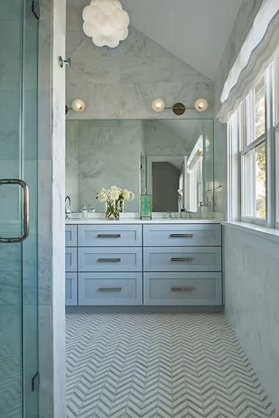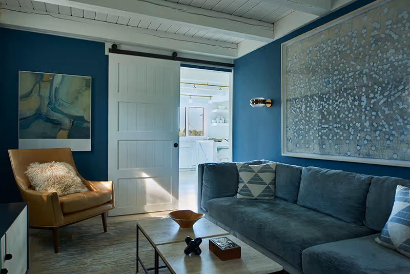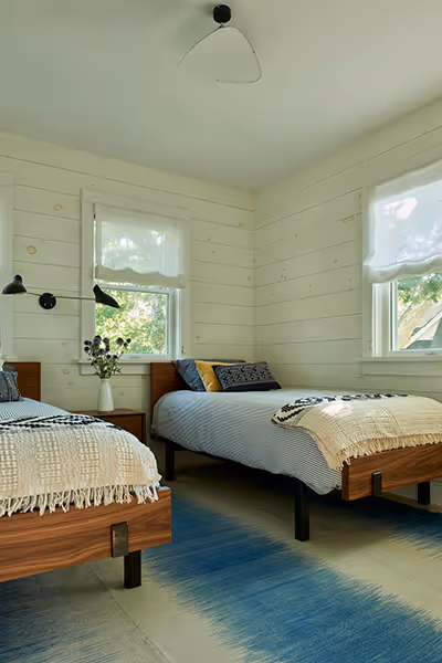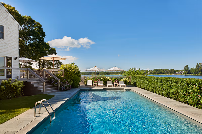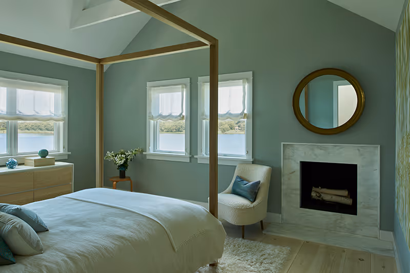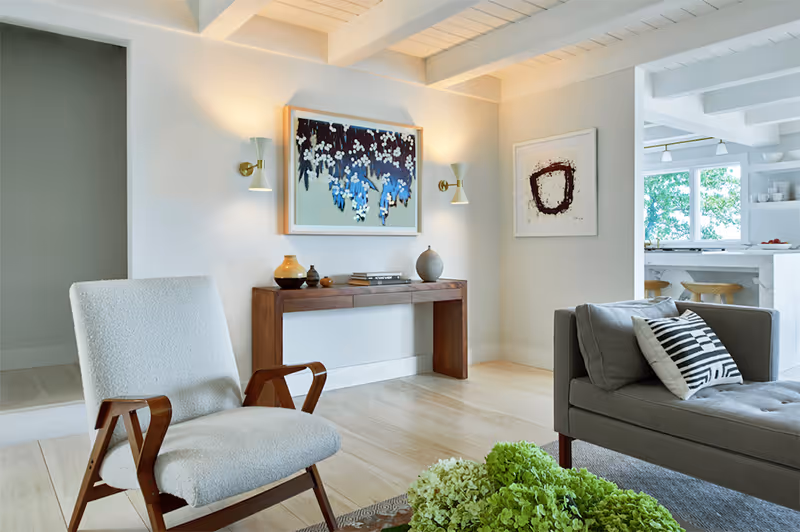 This waterfront property in Sag Harbor originally looked like a rustic cabin deep in the woods. The town put a freeze on rebuilding in 2014, which created opportunities to reimagine the existing 1,800 square foot space. The enclosed kitchen was opened up allowing in light and water views. The bedrooms were moved upstairs, each with adjoining new baths. White pine floors were installed, a soft white paint calmed the rough hewn beams, also creating an illusion of a higher ceiling. Soothing blue and green hues flow through each room with comfort and ease. Finding the right scale furniture to fit in each space was a jigsaw puzzle, many pieces were custom made. A vintage coffee table, floor lamps and accessories add an extra layer, providing a soft and serene escape all year around.